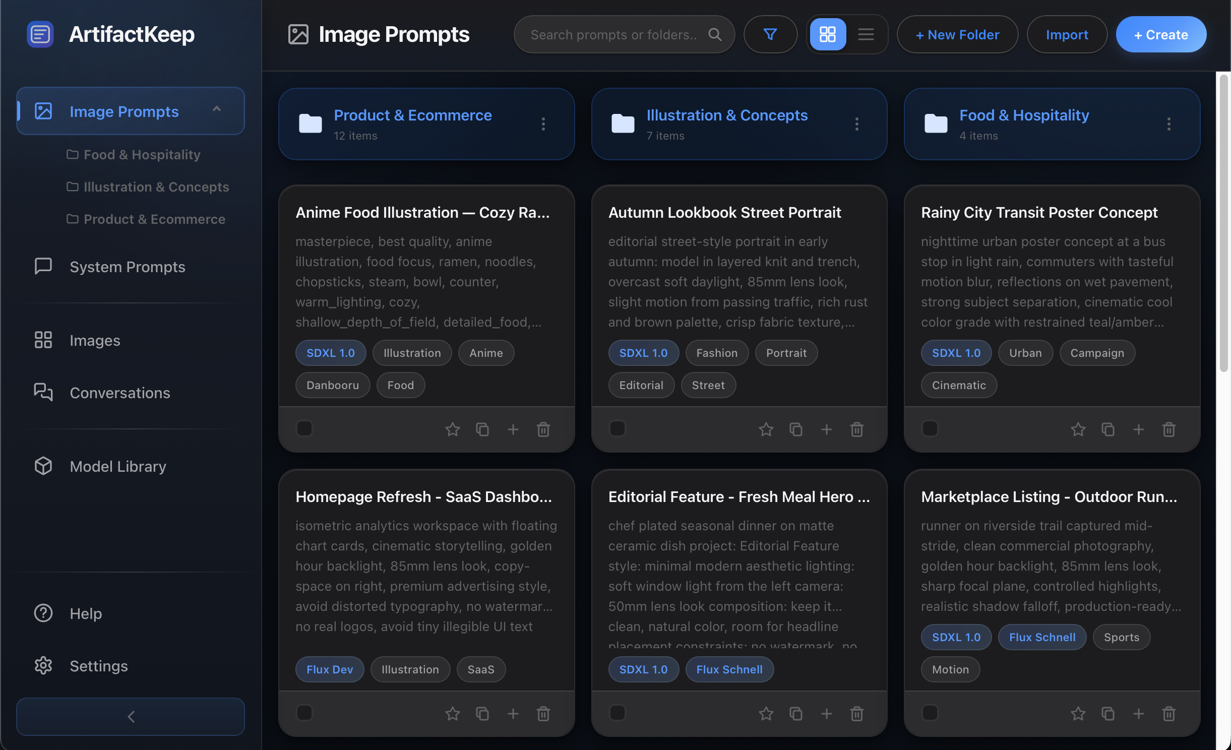 Store and organize your image generation prompts in one place. Add thumbnails, tags, model names, and folders, then switch between card and list views.